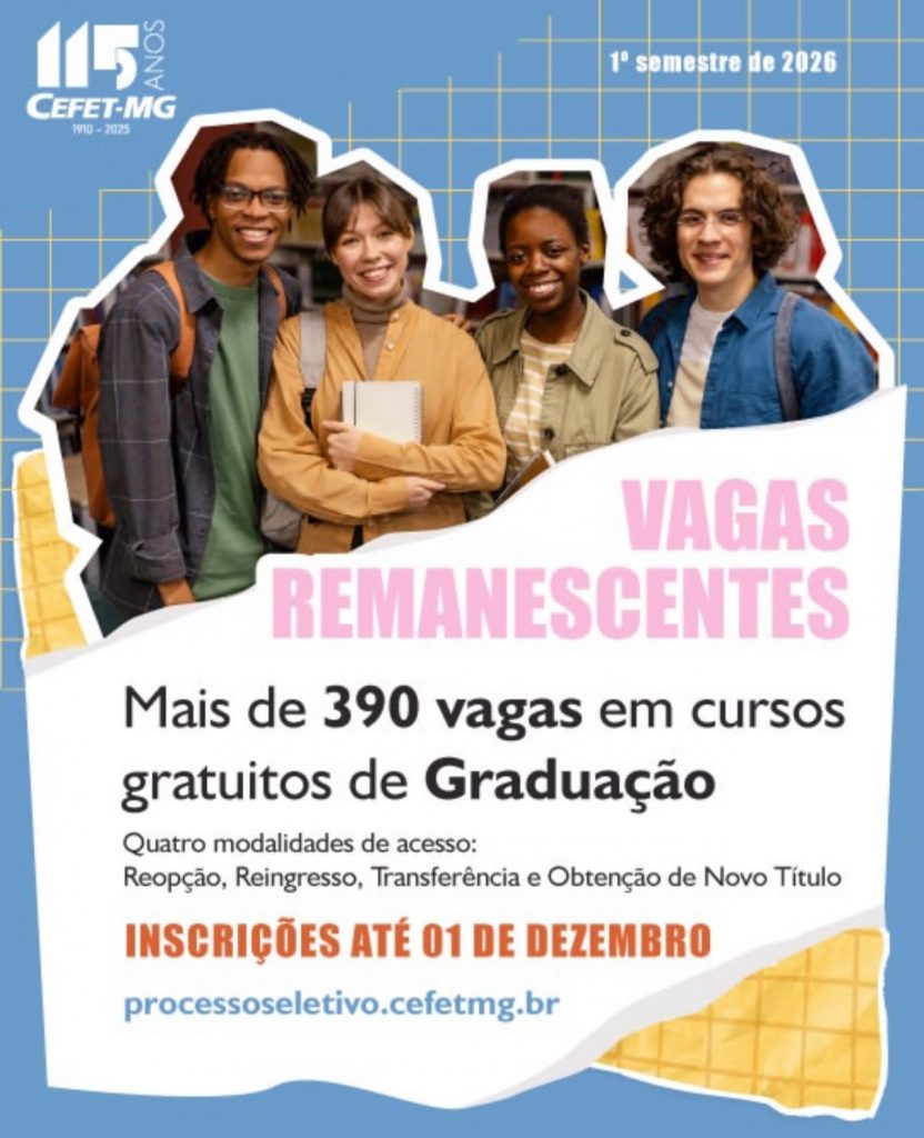 Estão abertas, de 17 de novembro a 1º de dezembro, as inscrições de candidatos a vagas remanescentes nos cursos de Graduação do CEFET-MG. São 86 vagas para pessoas interessadas em reopção de curso, 96 para reingresso, 113 destinadas à transferência e 98 para obtenção de novo título. Há oportunidades para todos os campi da Instituição em Minas com ingresso no 1º semestre de 2026.